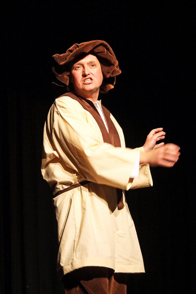 He wears the attire of a typical medieval servant – a frock, belt, pant-socks, half-cloak and pointed snout boots.