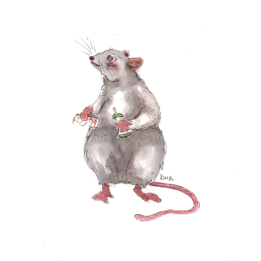 Now, it was his big moment. Cheesemould stood next to the handle of the trowel which presently was pointing up. He carefully checked the trajectory in relation to the cottage window pane above him. Then, inhaling a deep breath which filled his lungs, the rat jumped up into the air as high as he could go and flung himself on to the trowel handle. As he did this the metal end swiftly rose into the air, catapulting the pebbles towards the window pane.